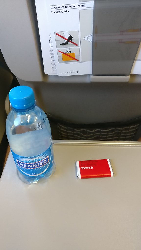 Il personale di bordo distribuisce acqua e un cioccolatino.