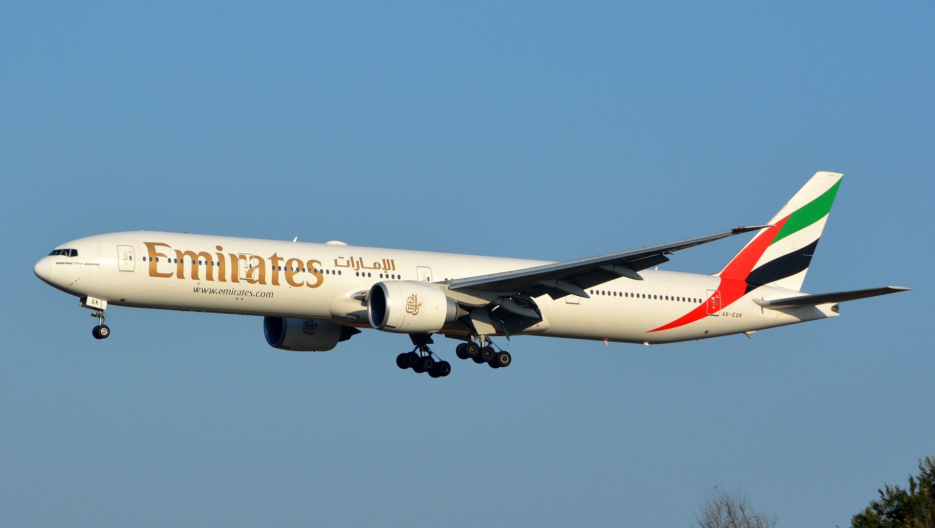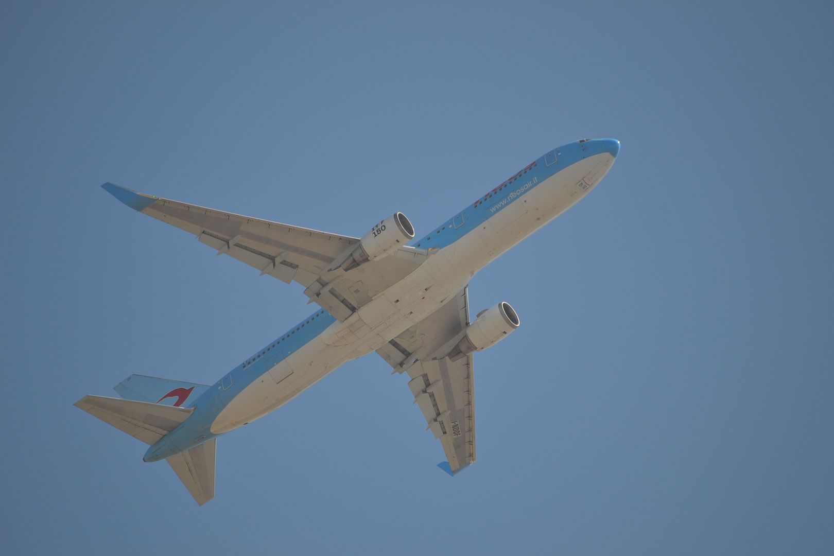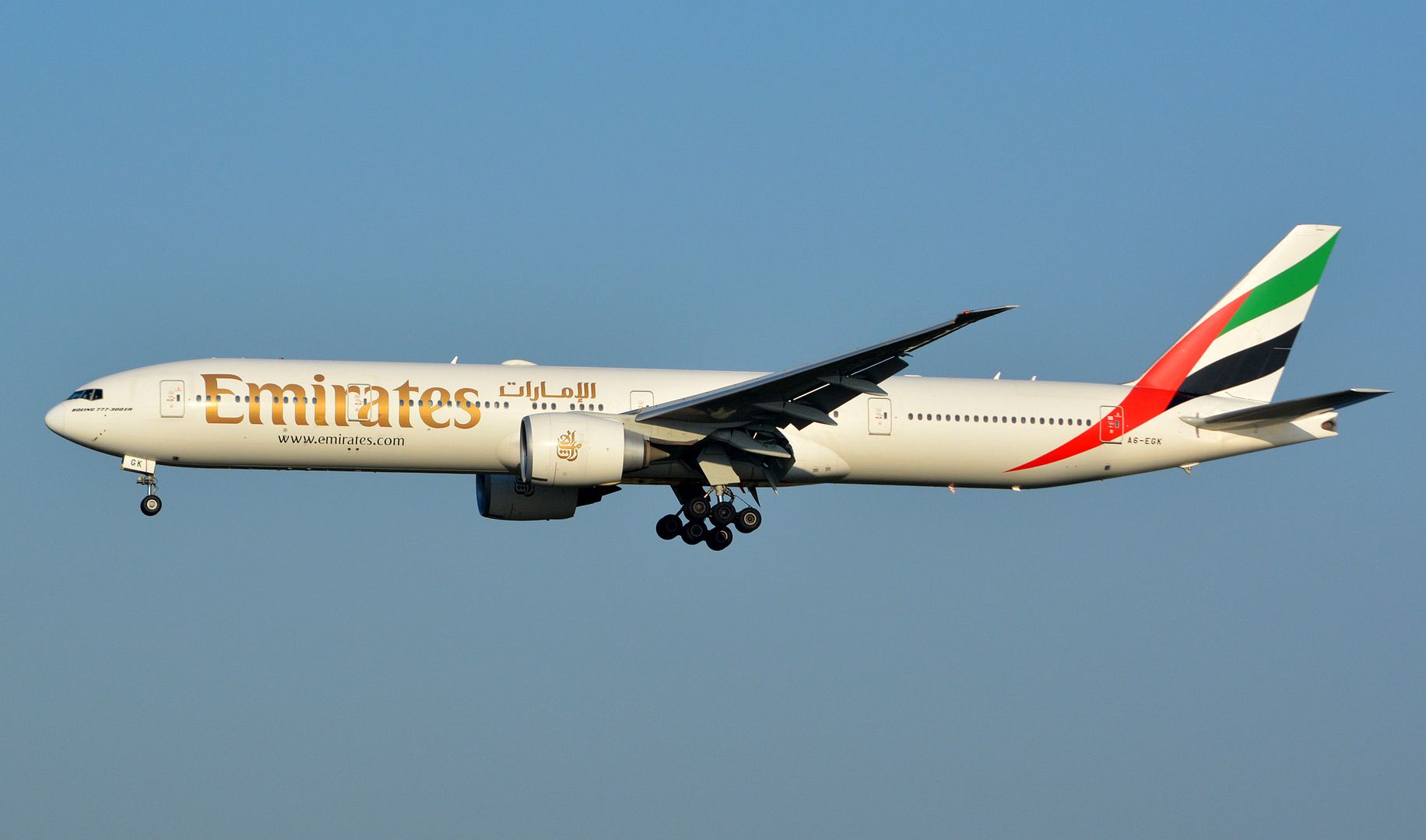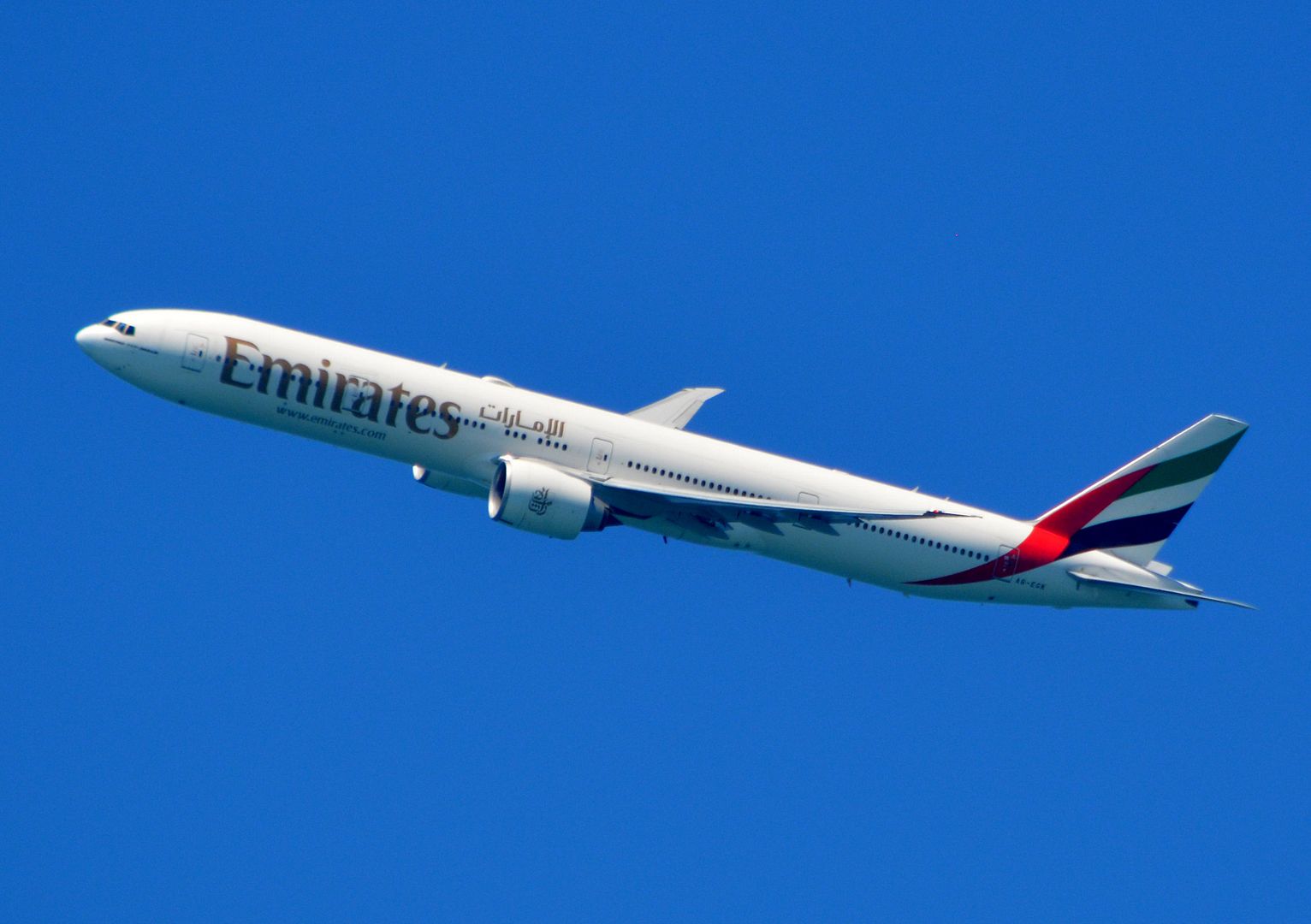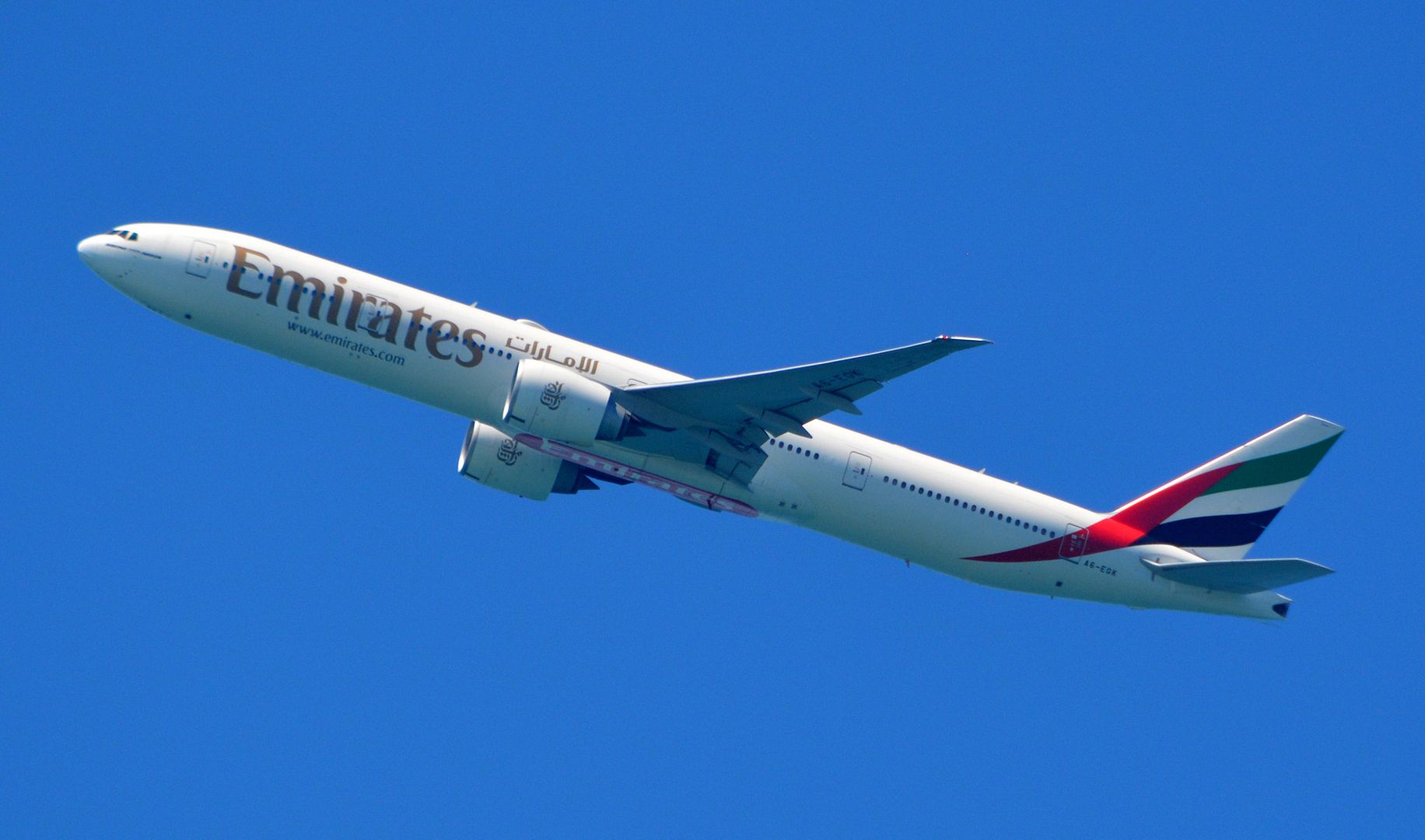 Emirates B777-300ER in decollo in virata, spottato da Via della Torre Clementina (molto lontano, con un 70-300), molto bello specialmente il cielo