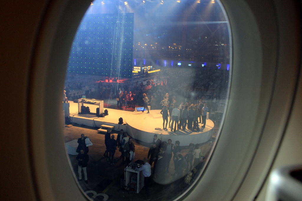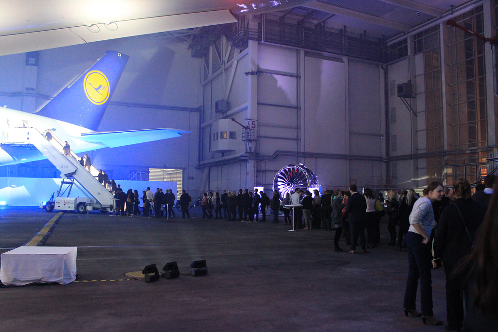 Appena usciti dall'area arrivi dell'Aeroporto di Monaco, ci si ritrova davanti al banchetto per le registrazioni, da dove si viene smistati verso le navette che da ora in avanti faranno continuamente la spola verso l'hangar sede dell'evento. Per l'occasione, Lufthansa ha deciso di fare le cose in grande: oltre alla stampa specializzata, al gotha LH, Airbus, e Rolls-Royce, nonché ai produttori di tutte le diverse componentistiche, all'evento sono stati invitati quasi 2.000 dipendenti della base di Monaco. Per farla breve, c'è praticamente chiunque non fosse di turno quest'oggi!