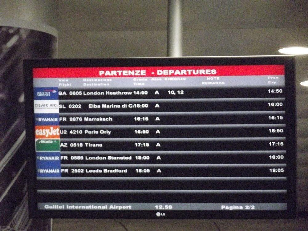 1 novembre: dopo un viaggio in treno di 4 ore arrivo a Pisa, prendo un taxi e raggiungo l'aeroporto che dista 1 km dal centro città.