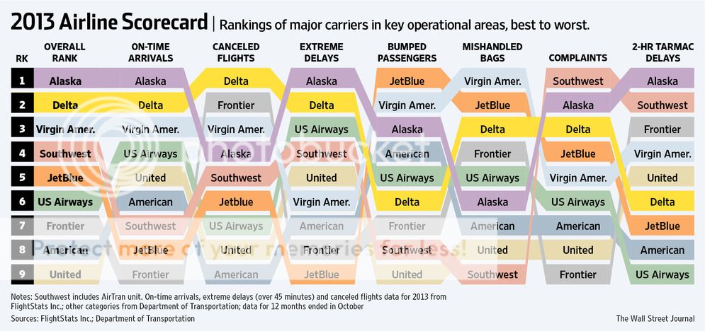 In the Middle Seat's annual scorecard of airline service, tracking seven different key measures of airline performance, Alaska Airlines performed best in 2013 among major carriers. At the top with Alaska was Delta, which for the past two years has posted far better operational results than big competitors. Worst among big airlines? United Airlines and American Airlines, again.