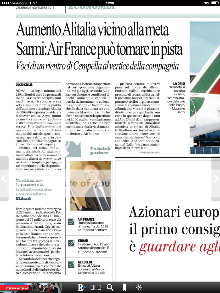 beh, noi poveracci con le ultime notizie siamo felicissimi! Ryan e vueling a fco, lufthansa e easy in ampliamento, emirates qatar e etihad dall'Italia al resto del mondo.... c'è solo l'imbarazzo della scelta su chi scegliere per inviare un CV! Dopotutto siamo giovani e con una nomea che ci precede! Faranno a botte per averci... eheeheh!Per lui forse no, per qui "poveracci" che in AZ ci lavorano magari fa la differenza tra portare il pane a casa o no....