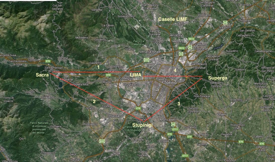A questo punto si va passando sopra i laghi di Avigliana verso Stupinigi, Palazzina di caccia dei Savoia, zona Sud di Torino. La Sacra è ovest.