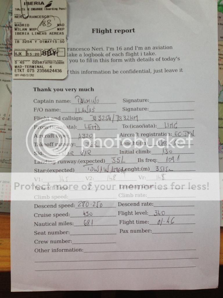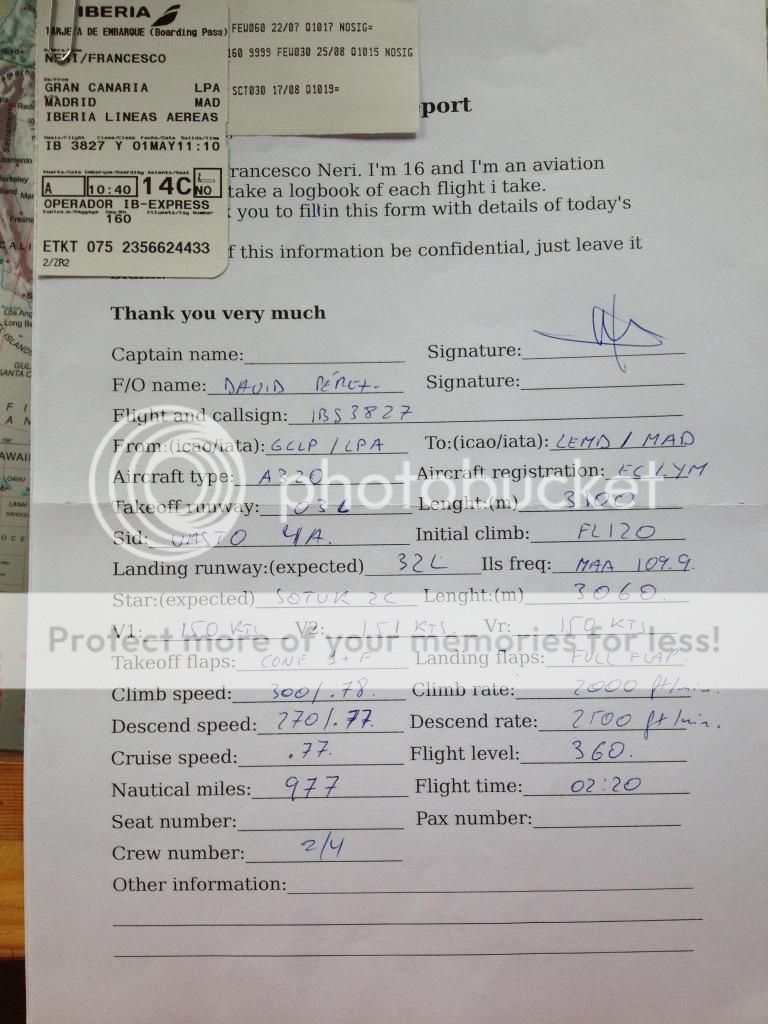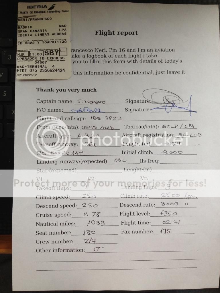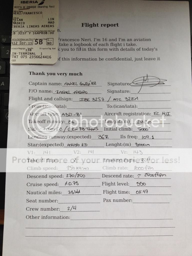 dopo il decollo ho dormito fino allo spegnimento dei motori a Madrid perdendomi cosi l'atterraggio per fortuna mio padre ha consegnato il flight report all'assistente di volo che lo riporta con una piccola sorpresa ovviamente potete immaginare il mio sorriso a 32 denti