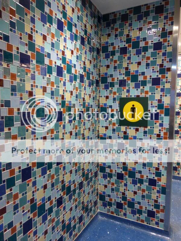 La prima cosa che faccio e' che vado al bagno a scaricar la tensione e scopro un bagno pieno di belle pubblicita del passato