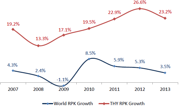 Turkish Airlines and world airlines RPK growth: 2007 to 2013
